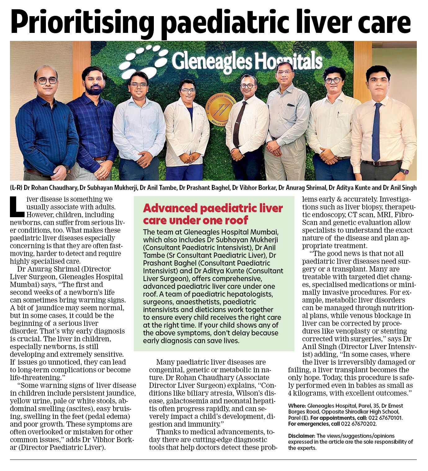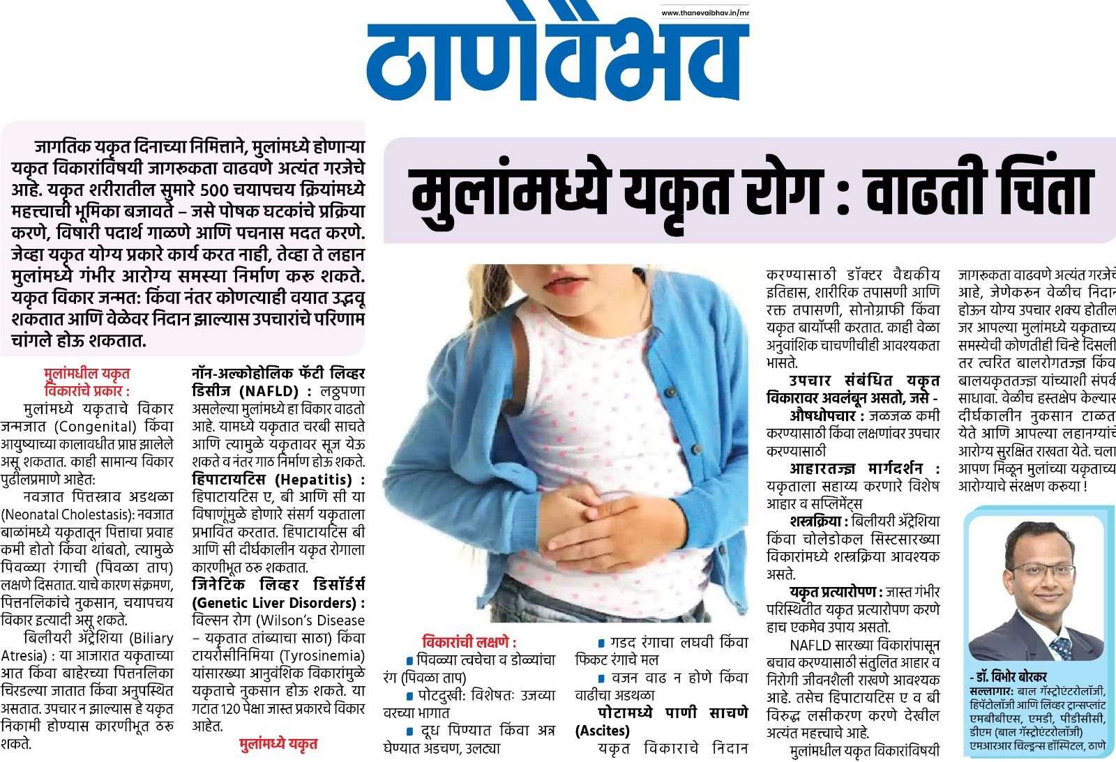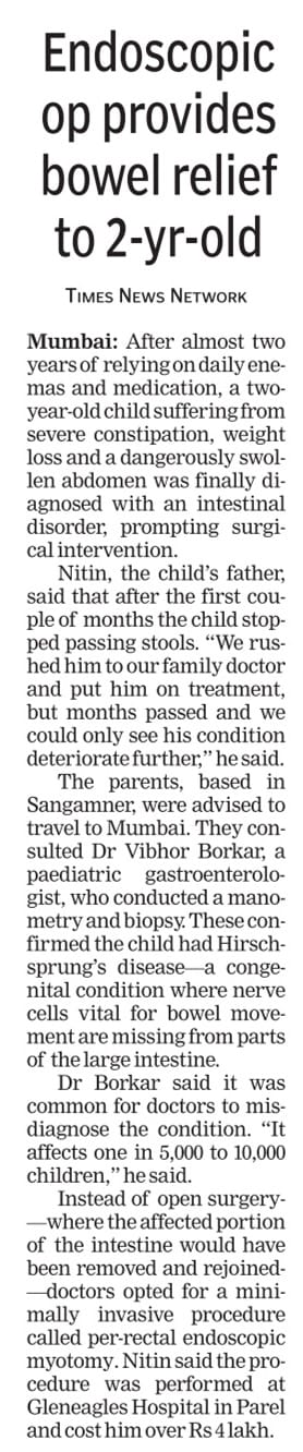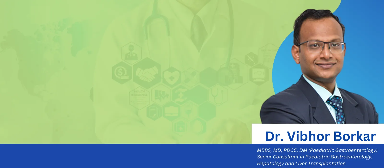 A: Leadership & Hospital Affiliations: A Career of Impact Dr. Vibhor Borkar's current and past hospital appointments reflect his standing as a key leader in his field: Current Leadership Roles: Director, Pediatric Hepatology, Gastroenterology & Transplant Medicine, Gleneagles Hospital, Mumbai. Visiting Pediatric Gastroenterologist, Lokmanya Tilak Municipal Medical College & Hospital, Sion, Mumbai- Mentor for fellowship program in Pediatric GI Previous Key Appointments: Dr. Borkar has been foundational in establishing and leading pediatric gastroenterology services at several of Mumbai's premier institutions, including: Senior Consultant & Department Coordinator, NH SRCC Children’s Hospital, (April 2017 to Jan 2022) Mumbai.- established pediatric liver transplant program and Pediatric GI department Director, Pediatric Hepatology, Gastroenterology & Transplant Medicine, Nanavati Max Hospital, Mumbai (Feb 2022- Nov 2024).- established pediatric liver transplant program Senior Consultant Pediatric Hepatologist, Global Hospital, Mumbai.- established pediatric liver transplant program, Pediatric Liver ICU. (June 2015 to March 2021) A Trusted Expert Across the Region: His expertise has also been sought as a Visiting Consultant by numerous other respected hospitals across Maharashtra, including Surya Hospital, BJ Wadia Hospital, Surya Hospital, MRR children's Hospital (Thane), Kiran hospital (Surat) Color's Hospital (Nagpur) and Aditya Birla Hospital (Pune), Kamal Nayan Bajaj Hospital (Aurangabad) among others. This extensive network of affiliations is a testament to his renowned clinical skills and his unwavering commitment to advancing pediatric care. He brings this wealth of experience to every patient consultation.
